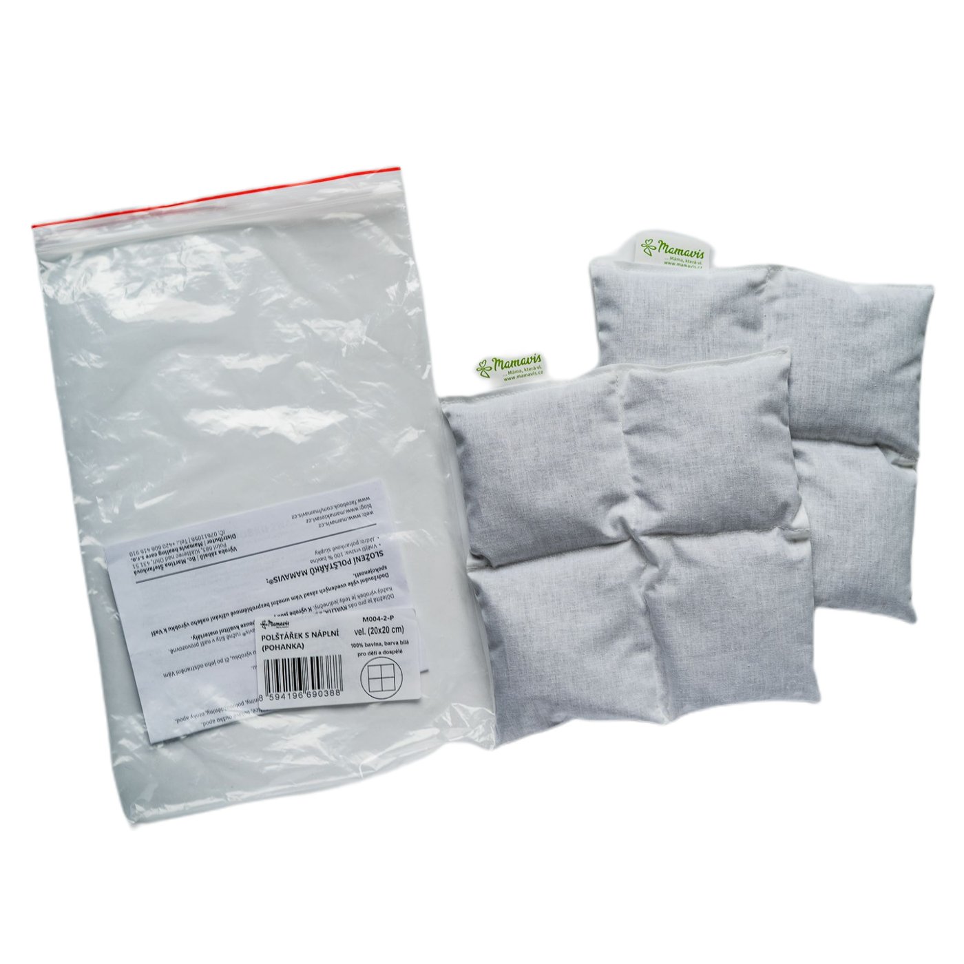 Polštářek (20 x 20 cm) je určený zejména do zábalů Mamavis pro dospělé na hrudník, bedra a kyčle (pro velikosti 75-105 cm, 100-130 cm, 125-155 cm). Zábaly na hrudník, břicho, záda a kyčle mají 2 všité kapsy, tudíž jsou v balení 2 kusy polštářků z pohankových slupek či třešňových pecek dle výběru.